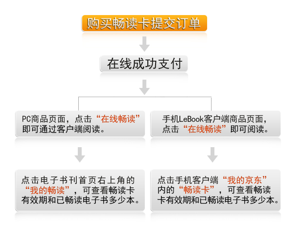 答:您购买“畅读卡”的订单支付成功后,系统将自动将您购买的“畅读卡”与您购买时所使用的京东账户绑定,该卡同时被自动激活。然后,当您找到自己喜欢的电子书,点击页面上的“在线畅读”按钮,即可通过京东电子书客户端LeBook阅读。